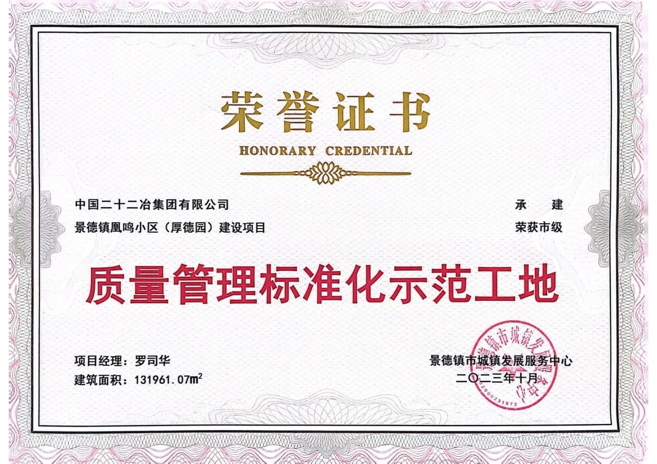 近日,景德鎮(zhèn)市城鎮(zhèn)發(fā)展中心公布了2023年度江西省建筑安全生產(chǎn)標(biāo)準(zhǔn)化示范工地名單,由江西公司承建的景德鎮(zhèn)凰鳴小區(qū)項(xiàng)目獲評(píng)2023年度“景德鎮(zhèn)市質(zhì)量管理標(biāo)準(zhǔn)化示范工地”稱號(hào)。這是繼“中國(guó)二十二冶集團(tuán)安全生產(chǎn)標(biāo)準(zhǔn)化工地”“景德鎮(zhèn)市建筑安全生產(chǎn)標(biāo)準(zhǔn)化示范工地”后,獲得的又一殊榮。