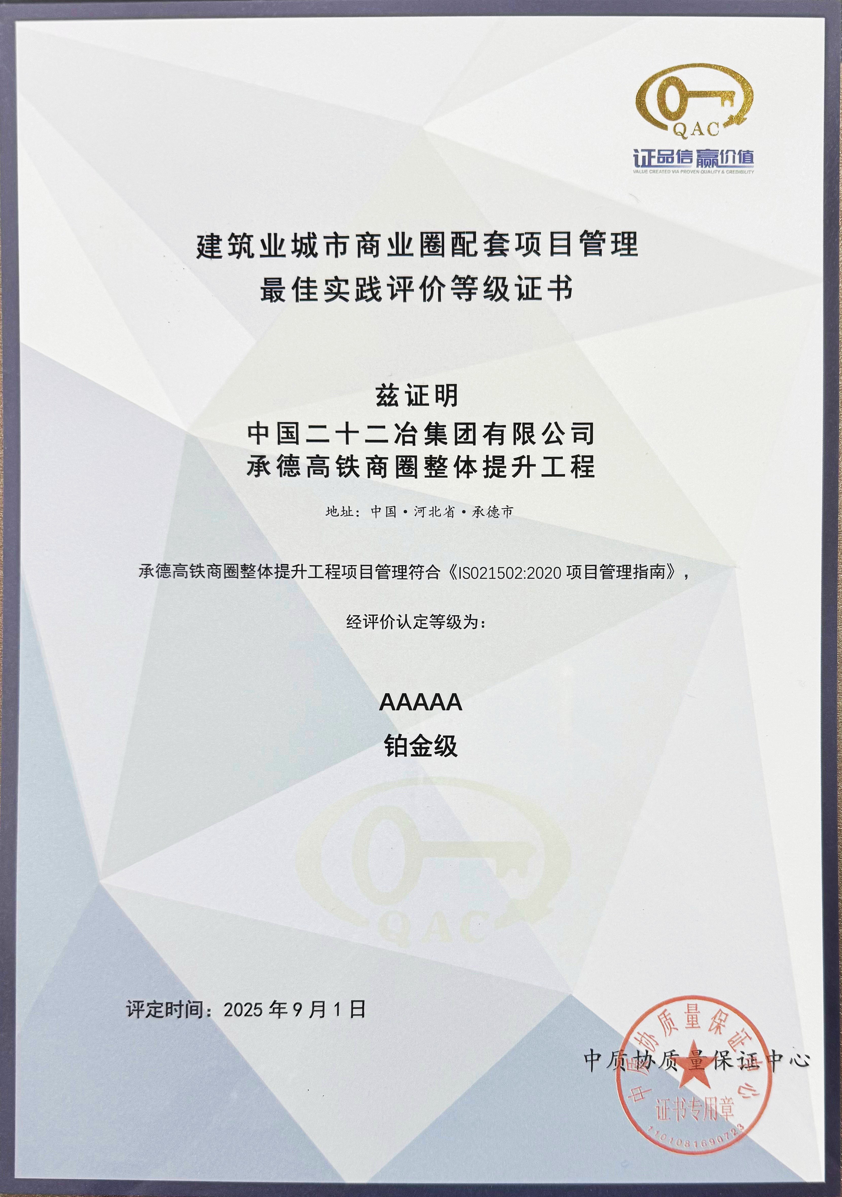 路橋公司承德高鐵商圈項目獲評“建筑業城市商業圈配套項目管理最佳實踐評價等級”最高認證