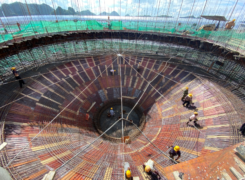 項目重難點分項工程——氧化鋁筒倉漏斗,漏斗高約7.5m,最大達20m,鋼筋用量更是多達100多噸,斜壁處混凝土澆筑采用邊支模邊澆筑方式進行,僅澆筑混凝土需要三天,整個施工工序復雜,技術要求高,工期要求緊。項目部根據現場施工條件和作業環境,合理制定施工方案,做好人員培訓和安全、技術交底。施工現場采取倒計時加壓方式,項目經理親自帶項目部管理人員深入現場,靠前指揮,及時協調解決過程中出現的各種問題,全力確保安全、質量的前提下完成工程節點。目前氧化鋁新鮮倉漏斗已完成模板鋪設,鋼筋綁扎完成80%,預計9月16日進行混凝土澆筑,確保工期節點要求。