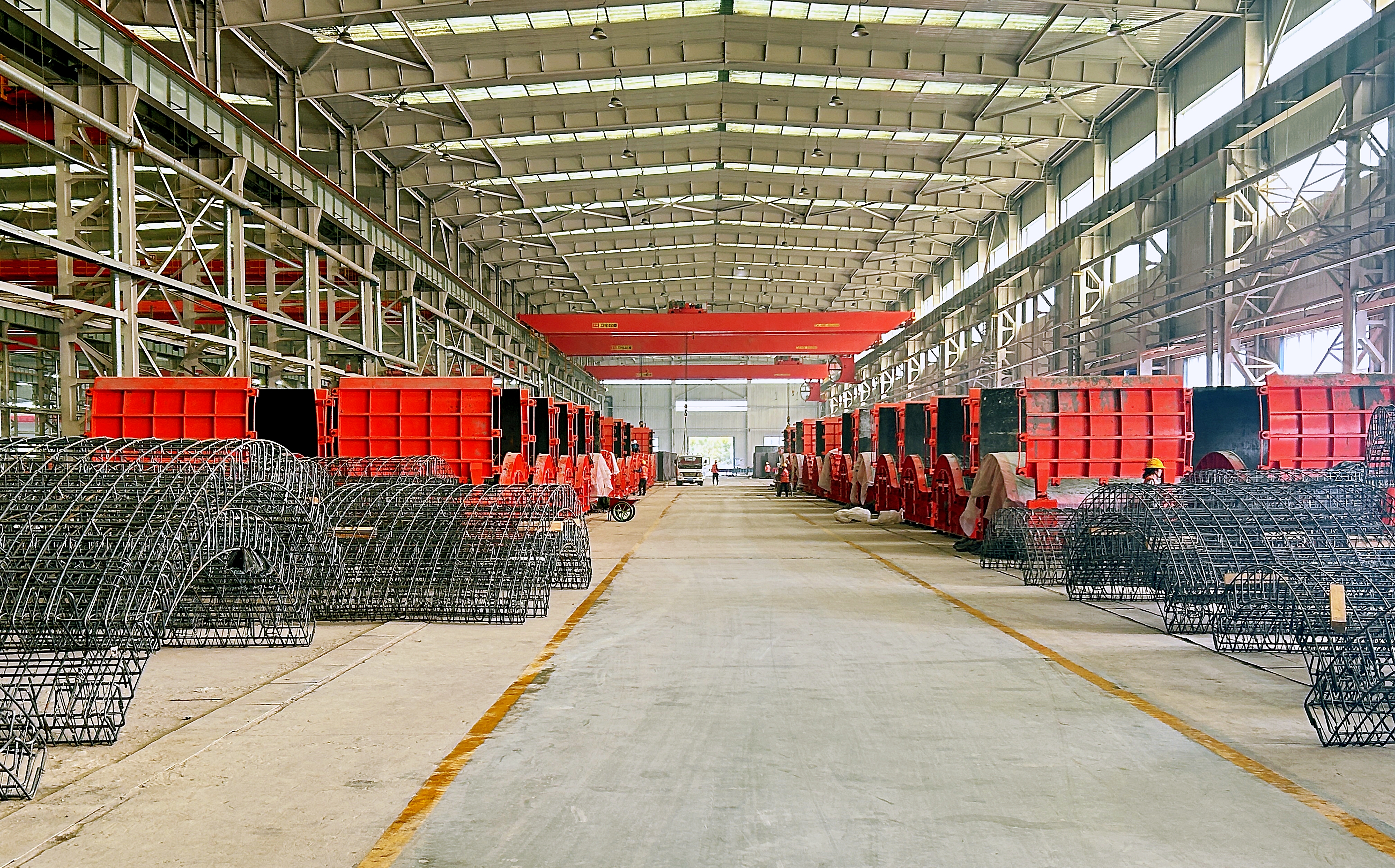 近日,裝配式公司生產廠內焊花四濺、機聲隆隆,到處擺放著正在加工的塔筒管片,工人們忙著綁扎鋼筋籠、打磨清理磨具、埋件預埋、混凝土澆筑、生產車間內外,質檢員則對生產好的管片進行回彈檢測混凝土強度和保護層厚度測試。