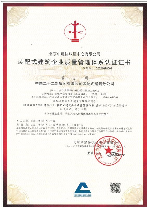 4月21日,裝配式建筑分公司收到由北京中建協認證中心有限公司頒發的《裝配式建筑企業質量管理體系認證》證書,證書注冊號為02321QP0001。此次證書的獲得,標志著公司裝配式建筑質量管理體系能力得到了充分認可,對公司搶占市場先機、提升行業話語權、擴大裝配式市場占有率、提升企業品牌知名度、提升公司綜合管理效率具有重要意義。